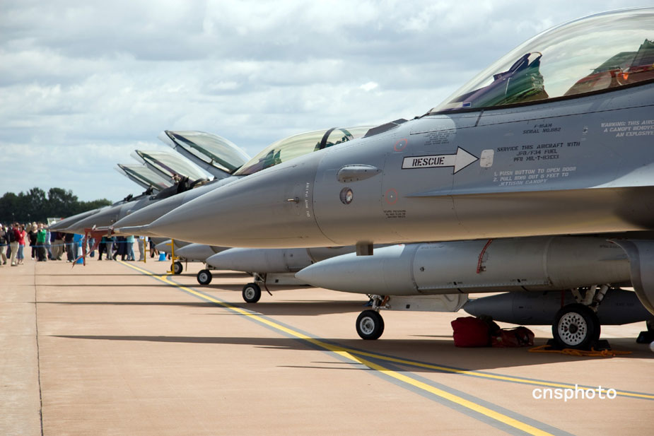 2009年7月,“2009英國費爾福德航展”在英格蘭費爾福德開展。圖為費爾福德航展上,來自各國空軍的F-16戰(zhàn)斗機在停機坪上依次排開,氣勢逼人。中新社發(fā) 潘禹 攝