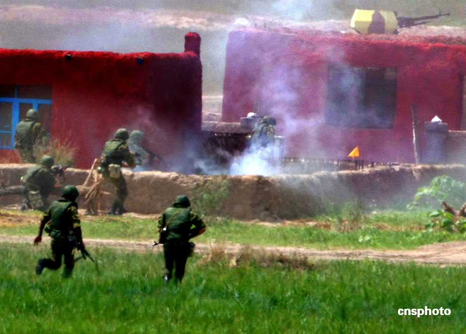 中國、俄羅斯兩軍總參謀長,7月23日上午到沈陽軍區洮南合同戰術訓練基地,觀看“和平使命2009”聯合反恐軍事演習。雙方以陸軍和空軍為主,中方參演部隊包括1個陸軍戰斗群和1個空軍戰斗群。俄方參演兵力包括1個陸軍加強摩步營、1個空降突擊連和部分空軍兵力,雙方投入兵力兩千多人。中新社發 宋吉河 攝