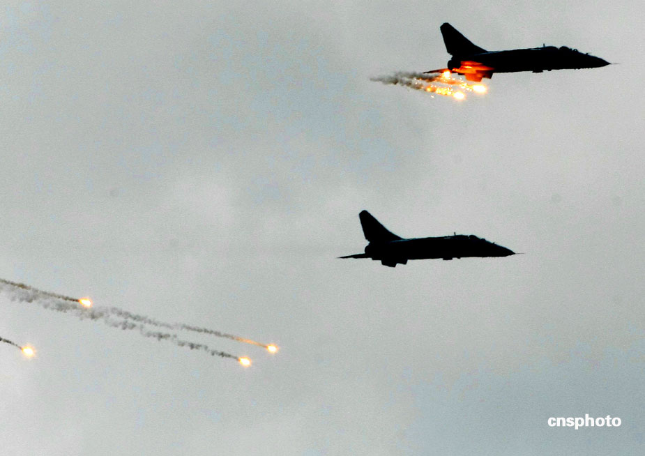 中國、俄羅斯兩軍總參謀長,7月23日上午到沈陽軍區洮南合同戰術訓練基地,觀看“和平使命2009”聯合反恐軍事演習。雙方以陸軍和空軍為主,中方參演部隊包括1個陸軍戰斗群和1個空軍戰斗群。俄方參演兵力包括1個陸軍加強摩步營、1個空降突擊連和部分空軍兵力,雙方投入兵力兩千多人。中新社發 宋吉河 攝