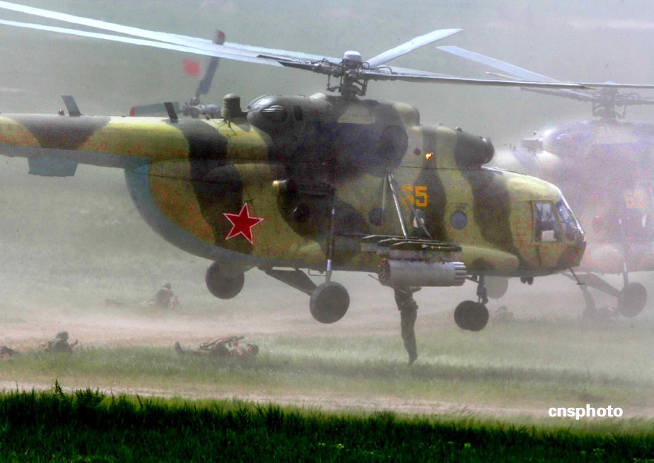 中國、俄羅斯兩軍總參謀長,7月23日上午到沈陽軍區洮南合同戰術訓練基地,觀看“和平使命2009”聯合反恐軍事演習。雙方以陸軍和空軍為主,中方參演部隊包括1個陸軍戰斗群和1個空軍戰斗群。俄方參演兵力包括1個陸軍加強摩步營、1個空降突擊連和部分空軍兵力,雙方投入兵力兩千多人。中新社發 宋吉河 攝