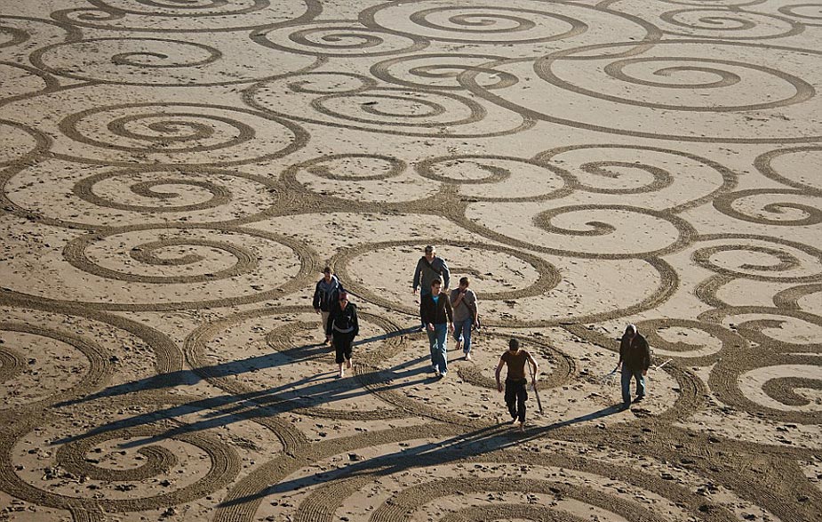 據英國媒體7月27日報道,藝術家Andres Amador用耙子在沙灘上作畫,眾多中心對稱的幾何圖形,不在乎是否能長久保留,但求被海浪帶走前與大自然的完美融合。