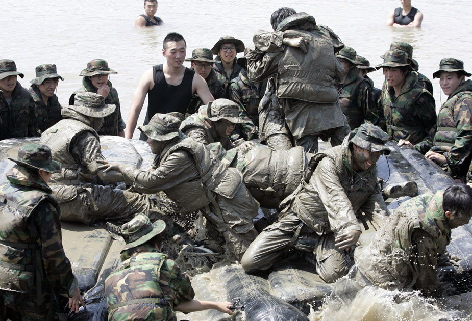 當地時間7月30日,在首爾的美軍基地參加軍訓夏令營的韓國數百名學生來到金浦進行了泥地訓練,場面十分激烈甚至殘酷。