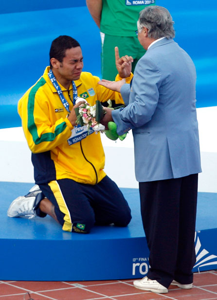 “能再給我一塊嗎?”——7月29日,巴西選手席爾瓦獲得男子50米蛙泳銀牌后長跪在領獎臺上。