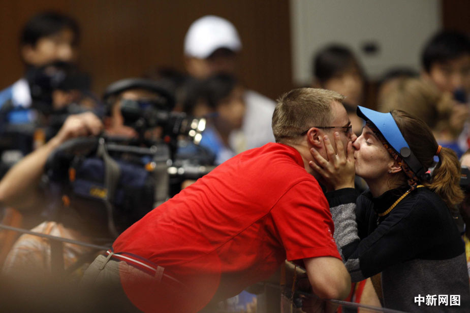 擊落頭金—— 8月9日,北京奧運會開賽的第一天,女子10米氣步槍決賽在北京射擊館進行。捷克選手卡特日娜·埃蒙斯以503.5環獲得金牌,同時也是本屆奧運會產生的首枚金牌。圖為埃蒙斯獲勝后親吻丈夫。