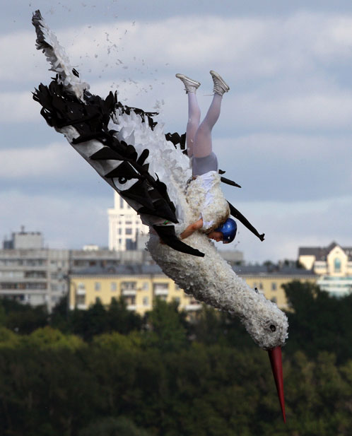 8月9日,莫斯科河畔舉辦一年一度的“墜落節”,表演者帶著自己設計制作的各種“飛行器”勇敢的從高空跳入水中。