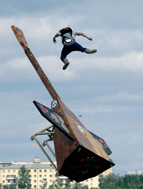 8月9日,莫斯科河畔舉辦一年一度的“墜落節”,表演者帶著自己設計制作的各種“飛行器”勇敢的從高空跳入水中。
