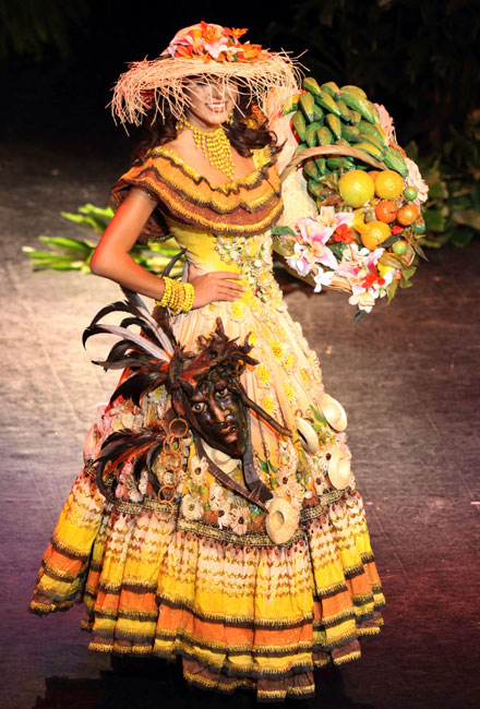 8月10日,2009年世界小姐大賽上,來自84個國家和地區的佳麗進行民族服飾的展示,各國佳麗分別穿著含有自己民族風格元素的時尚晚裝亮相,現場頓時色彩斑斕,美不勝收。