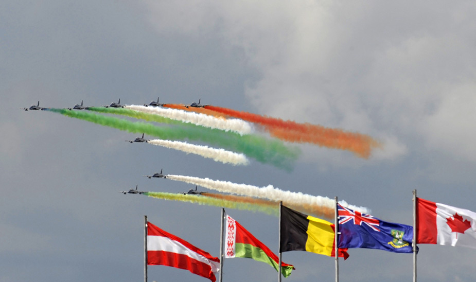 8月19日,在俄羅斯茹科夫斯基市舉行的國際航空航天展上,意大利空軍“三色箭”飛行表演隊奉獻精彩的飛行表演。