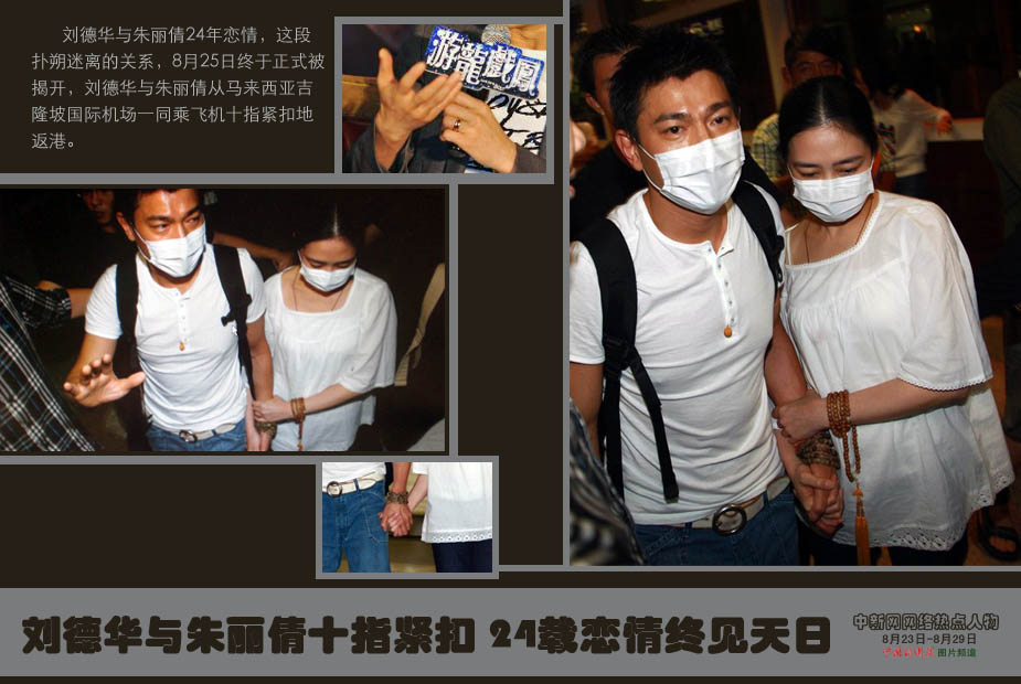 中新網本周熱點人物之——劉德華與朱麗倩 劉德華與朱麗倩24年戀情,這段撲朔迷離的關系,8月25日終于正式被揭開,兩人繼日前結伴到岳父墓前拜祭后,劉德華與朱麗倩從馬來西亞吉隆坡國際機場一同乘飛機十指緊扣地返港。