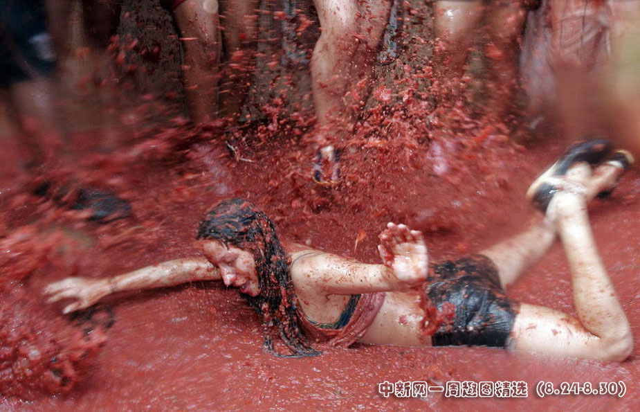 8月26日,西班牙東南部小鎮Bunol當日迎來傳統的西紅柿節。大約4萬名狂歡者在1小時內扔掉了11萬公斤西紅柿。圖片來源:中國新聞網