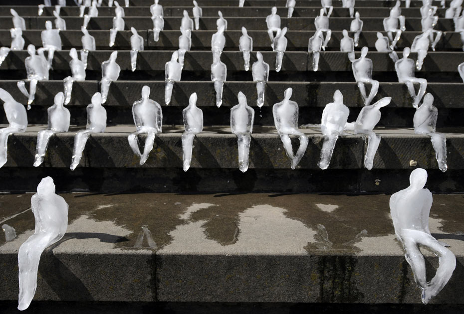 9月2日,德國柏林,世界野生動物基金會(WWF)將1000個小冰人被放置在了御林廣場音樂廳的臺階上,小冰人慢慢融化成水。活動的組織者希望此舉能引起公眾對于全球變暖的關注。來源:中國新聞網