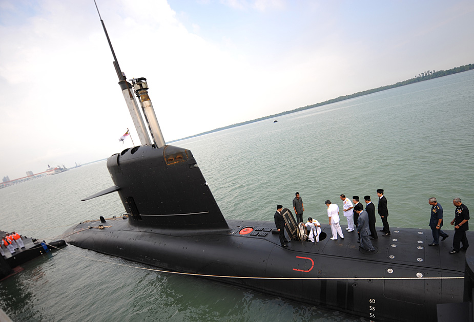 9月3日,由法國制造的馬來西亞首艘“鲉魚”級潛艇“東古·阿卜杜勒·拉赫曼”號駛?cè)腭R來西亞首都吉隆坡的克朗港。圖片來源:中國新聞網(wǎng)