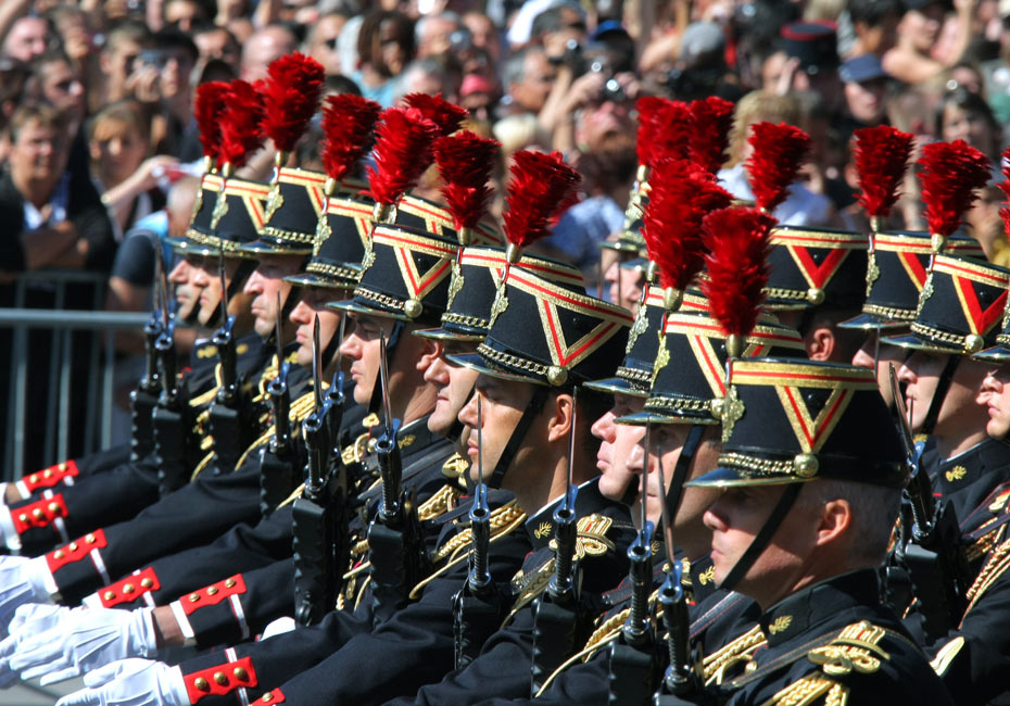 2009年7月14日,法國在巴黎香榭麗舍大道上舉行傳統閱兵儀式,慶祝該國國慶節,圖為法國共和國衛隊接受檢閱。