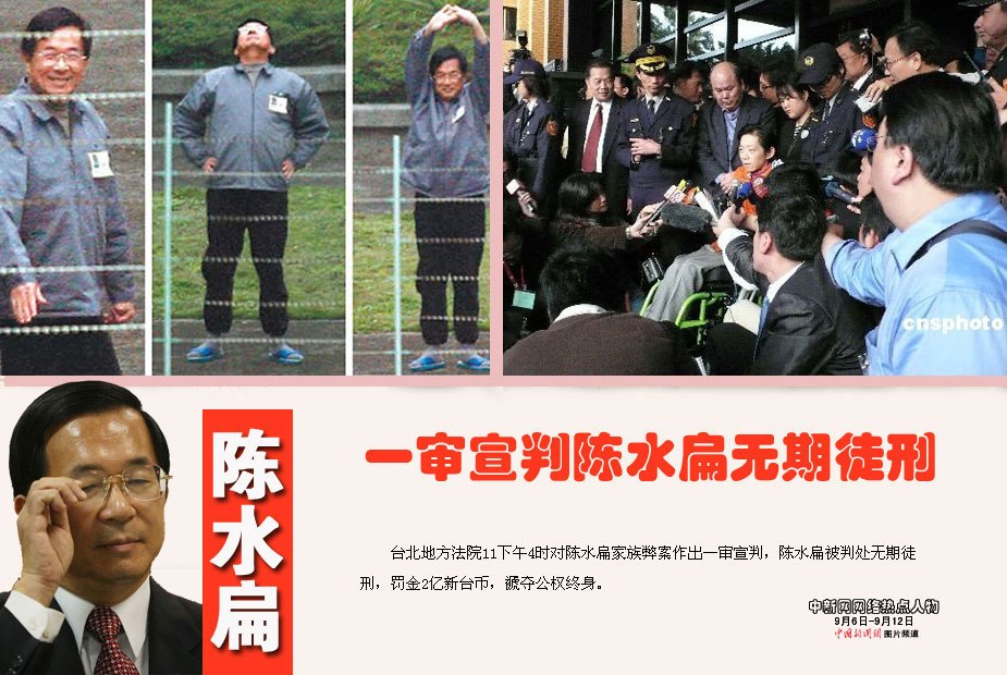 中新網本周熱點人物之——陳水扁 臺北地方法院11下午4時對陳水扁家族弊案作出一審宣判,陳水扁被判處無期徒刑,罰金2億新臺幣,褫奪公權終身。