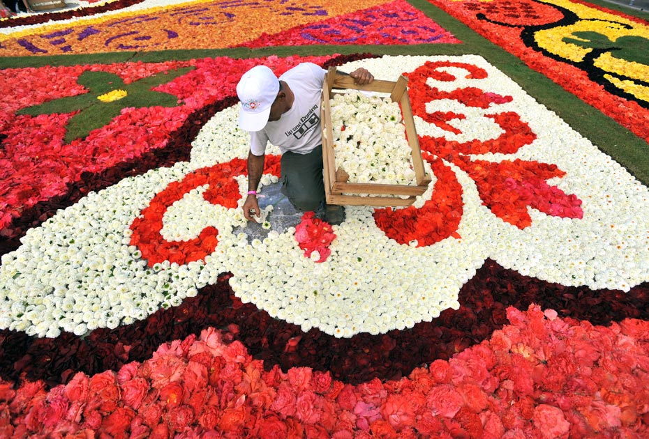 據悉,原本計劃全部使用以色列的鮮花,但由于當地的鮮花產量不足,只能從布魯塞爾進口,這批鮮花每朵花的直徑都在20厘米左右。百名志愿者們費時7小時精心鋪成了這張花毯,這張鮮花地毯將展示三天,隨后將被生態埋葬。