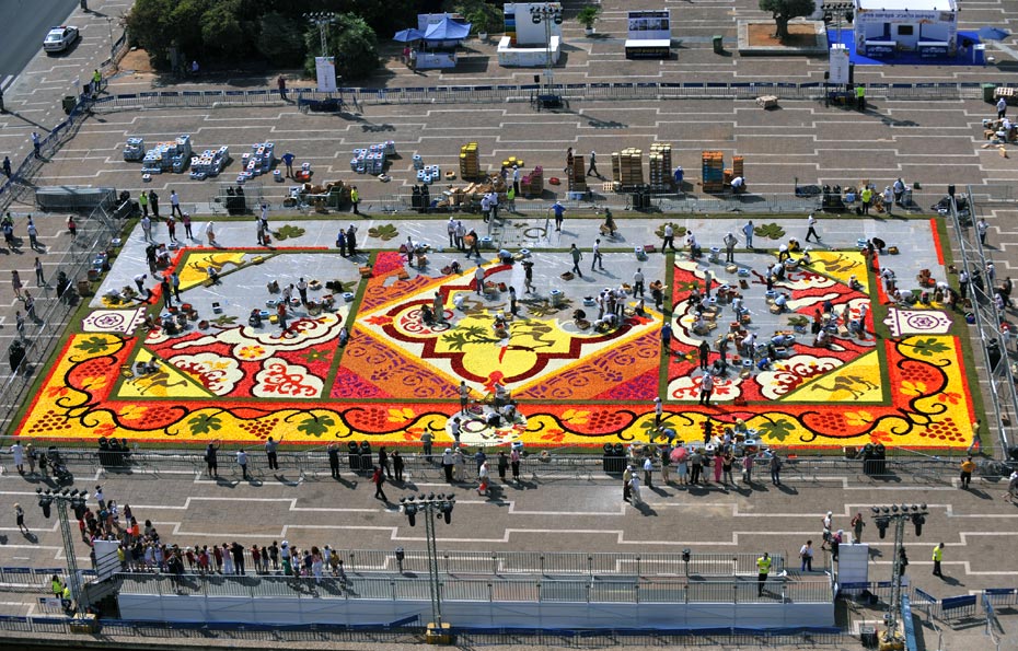 據(jù)悉,原本計劃全部使用以色列的鮮花,但由于當?shù)氐孽r花產(chǎn)量不足,只能從布魯塞爾進口,這批鮮花每朵花的直徑都在20厘米左右。百名志愿者們費時7小時精心鋪成了這張花毯,這張鮮花地毯將展示三天,隨后將被生態(tài)埋葬。