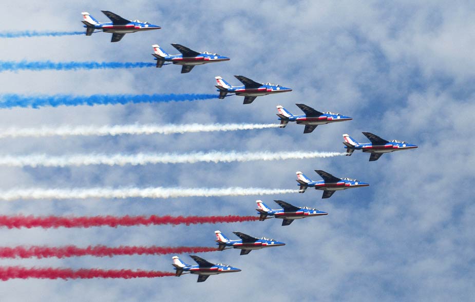 9月19日,智利首都圣地亞哥舉行了盛大閱兵式慶祝獨(dú)立199周年。圖為法國特技飛行表演隊(duì)“法蘭西巡邏兵”在閱兵儀式上進(jìn)行表演。