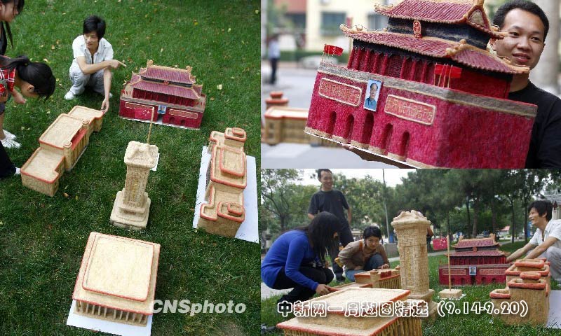 為迎接祖國60華誕,四川青年理發師黃鑫用40多公斤碎頭發制作了一個微型“天安門廣場”全景模型。圖片來源:中國新聞網