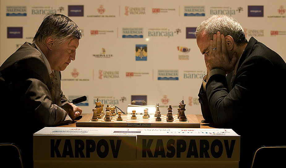 在本周,國際象棋界的兩位大師卡爾波夫(左)與卡斯帕羅夫在西班牙的巴倫西亞市開始了一場中斷25年的比賽。25年前,他們在爭奪世界冠軍的比賽中激戰5個月未分勝負。目前卡斯帕羅夫以2比0領先。圖片來源:中國新聞網