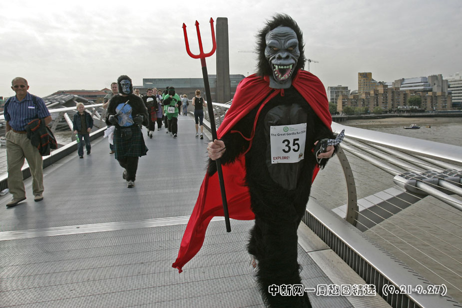 9月26日,一年一度的“大猩猩賽跑”在英國倫敦街頭舉行,人們紛紛打扮成大猩猩的模樣參加賽跑。圖片來源:中國新聞網(wǎng)
