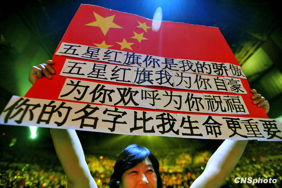 當?shù)貢r間9月20日,以“感動世界,中國有我”為主題的全球華人共慶新中國成立六十周年《同一首歌》——走進美國舊金山大型演唱會圓滿落幕。 一位宮姓女士自制了一面五星紅旗,用獨特的方式祝福新中國六十華誕。 中新社發(fā) 陳鋼 攝