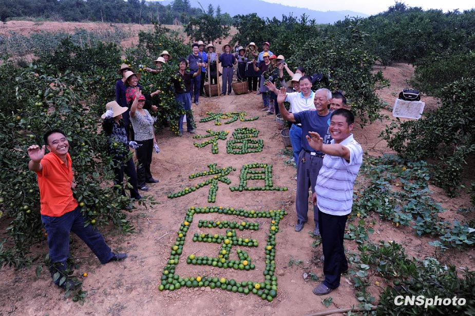 為慶祝新中國成立六十周年,湖南石門縣橘農近日用采摘的早熟蜜橘,在橘園擺成“祝福祖國”四個大字,表達對祖國六十華誕的美好祝愿。中新社發 賀新初 攝