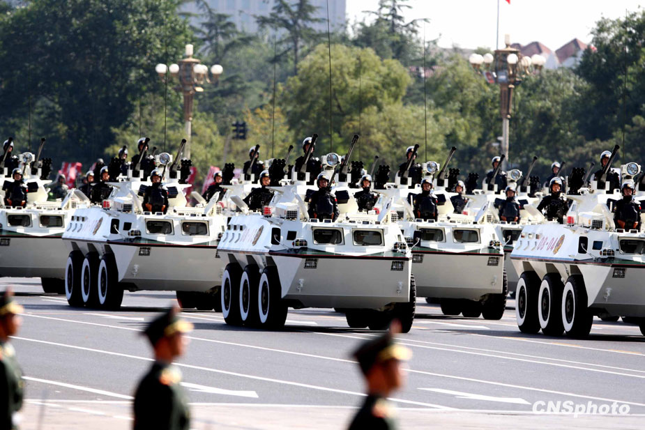 2009年10月1日,中華人民共和國(guó)成立60周年慶祝大會(huì)在北京天安門廣場(chǎng)舉行。圖為武警裝甲戰(zhàn)車。中新社發(fā) 宋吉河 攝