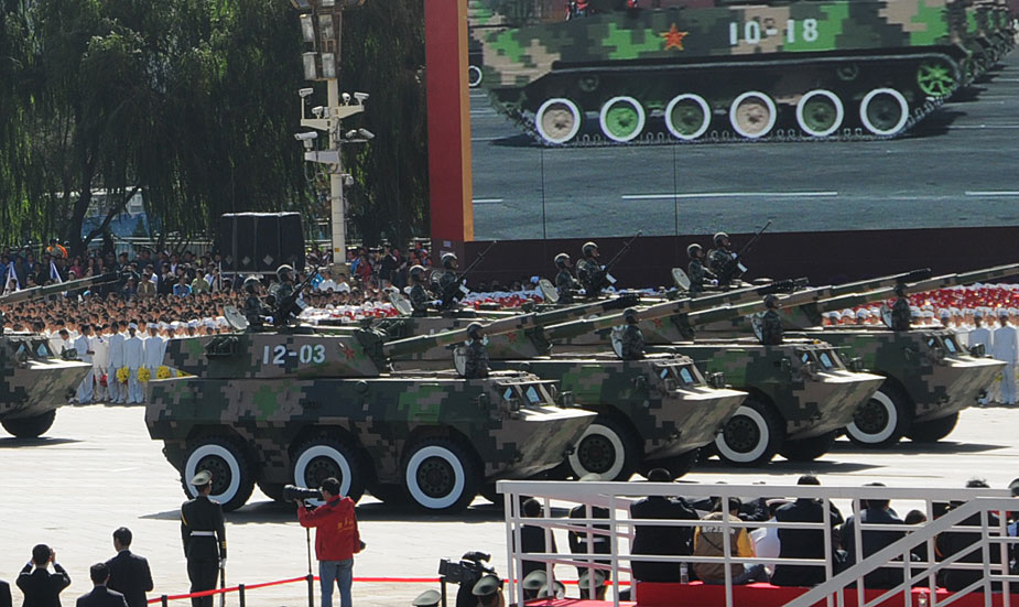 2009年10月1日,中華人民共和國成立60周年慶祝大會在北京天安門廣場舉行。圖為輪式自行突擊炮方隊(duì)。中新網(wǎng)記者 攝