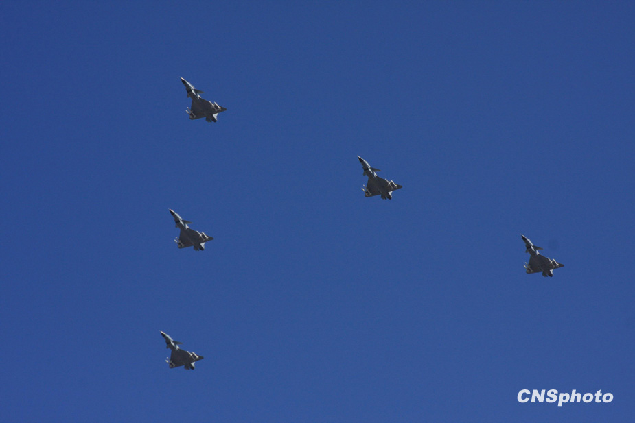 2009年10月1日,中華人民共和國成立60周年慶祝大會在北京天安門廣場舉行。圖為殲擊機梯隊飛過天安門廣場上空。中新社發 郭國權 攝