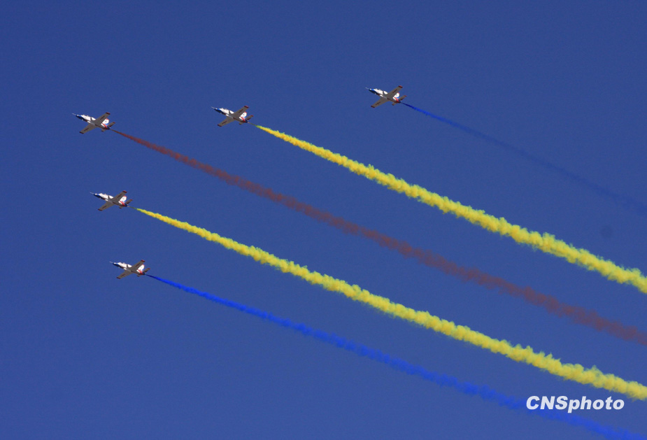 2009年10月1日,中華人民共和國成立60周年慶祝大會在北京天安門廣場舉行。圖為教練機梯隊飛過天安門廣場上空。中新社發 郭國權 攝