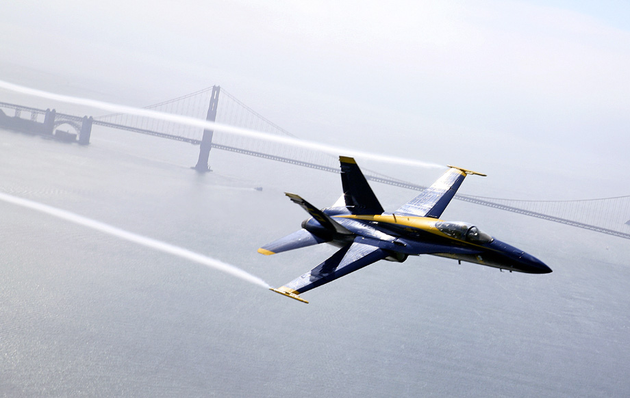 2009年10月8日,美軍飛機(jī)在舊金山灣上空進(jìn)行飛行演練。一年一度的舊金山艦隊(duì)周將于10月10日開幕,屆時(shí)會(huì)有船艦游行和飛行表演等活動(dòng)。 來源:中國新聞網(wǎng)