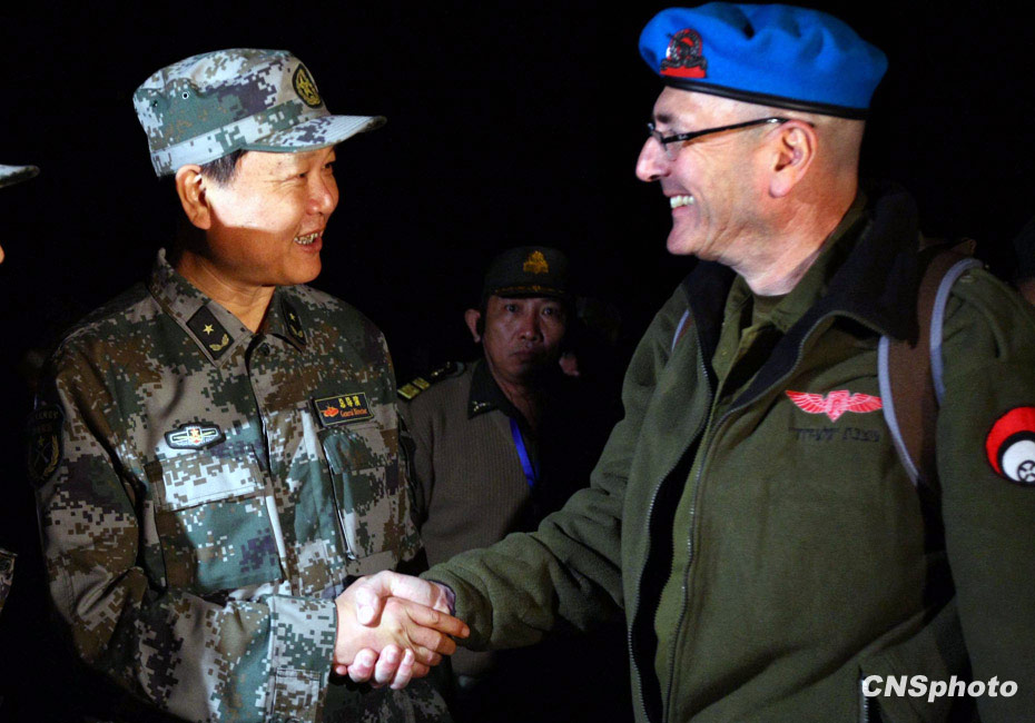 當晚國防大學防務學院、空軍指揮學院的外軍學員,以及英國、以色列、土耳其、巴基斯坦等國軍事觀察員親臨現場觀摩了后勤保障戰斗準備、自行榴彈炮占領陣地、裝甲車輛“摸黑”開進等戰斗要素。圖為演習總導演、某集團軍參謀長胡修斌少將,在陣地與外軍觀摩團他曾經的老朋友、老“同行”親切交談。中新社發 宋吉河 攝