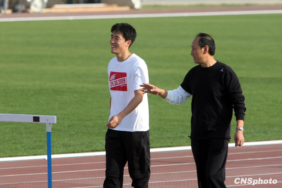 10月22日下午,“飛人”劉翔亮相濟(jì)南奧體中心田徑訓(xùn)練場,在教練孫海平的帶領(lǐng)下,輕松備戰(zhàn)全運(yùn)會(huì)。來源:中國新聞網(wǎng)