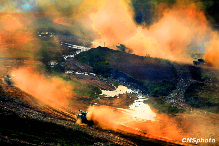 解放軍“前鋒-二00九A”演習,二十二日在濟南軍區某合同戰術訓練基地進行陸空聯合火力打擊實兵實彈演練。中新社發 宋吉河 攝
