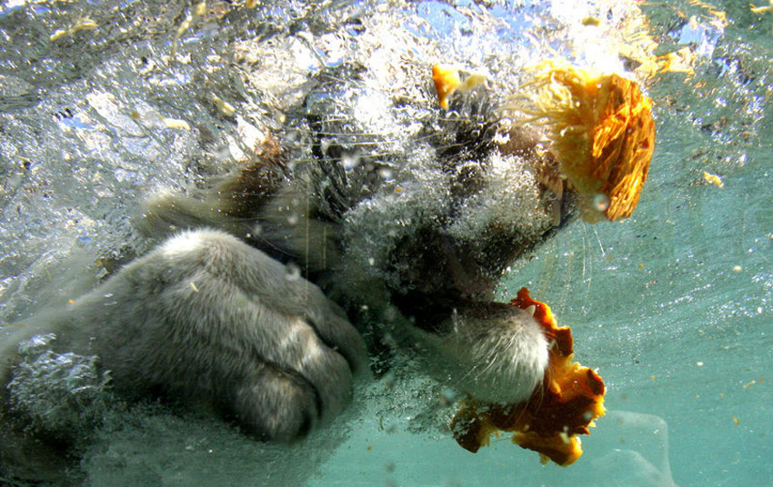 10月28日,美國加利福尼亞州Vallejo,六旗探索王國游樂園里的孟加拉虎在水下撕咬萬圣節(jié)南瓜。