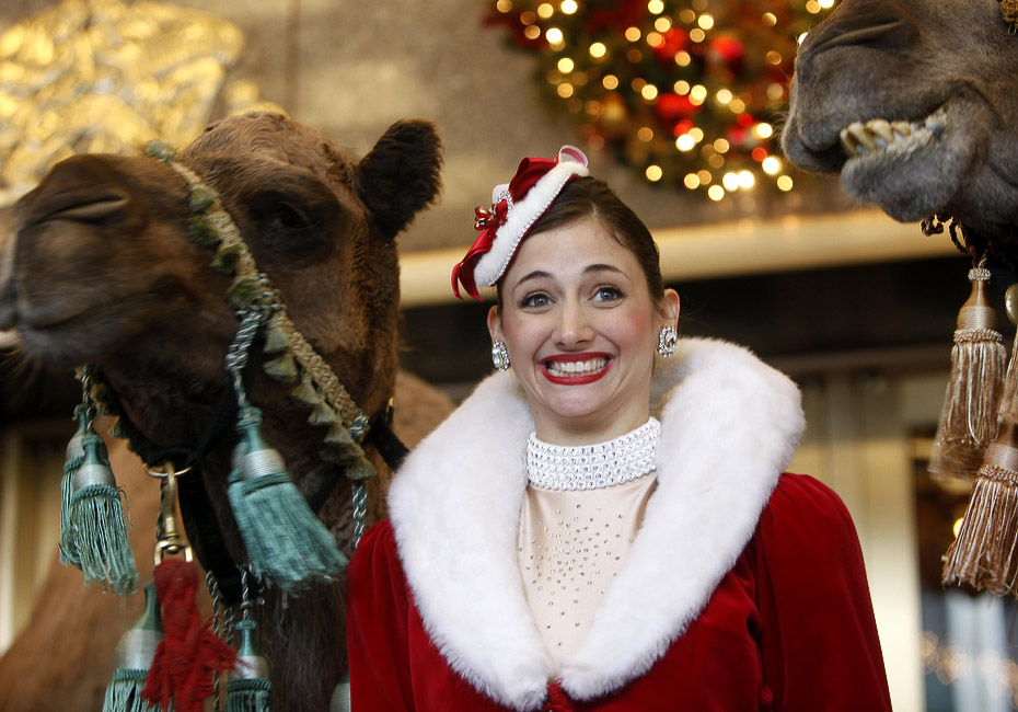 10月29日,火箭女郎舞蹈團的姑娘們在美國紐約廣播城音樂廳與眾多動物明星合影,準備在圣誕秀上亮相。圖片來源:中國新聞網