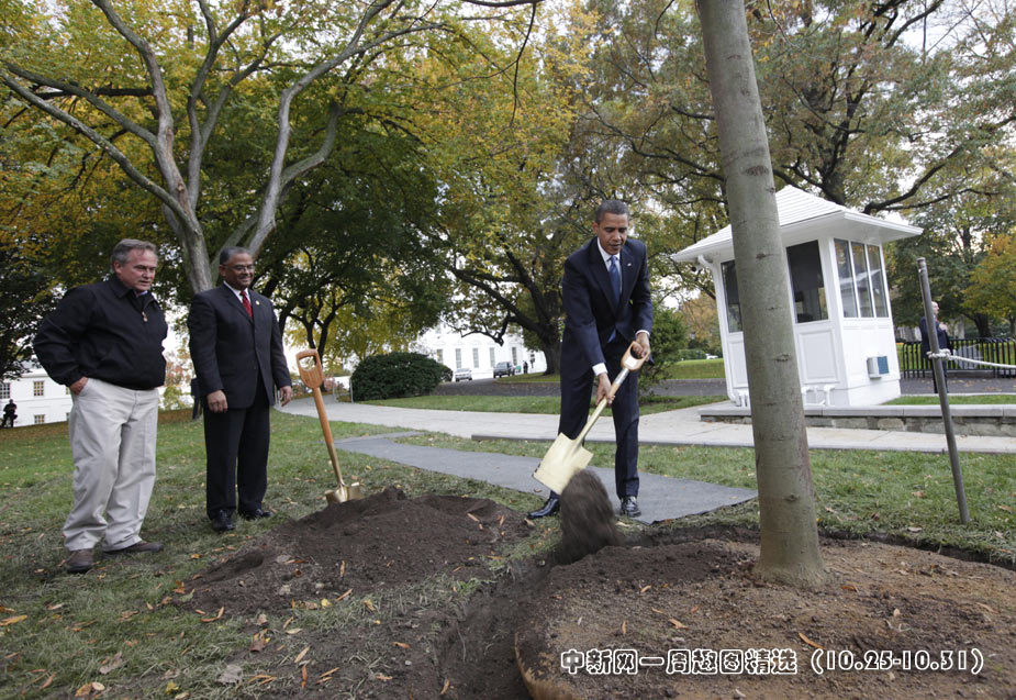 10月28日,美國華盛頓,總統(tǒng)奧巴馬在白宮北草坪上植樹。前總統(tǒng)布什曾于2008年4月在同樣的位置種下一棵樹,但未能成活。>>點擊觀看詳細(xì)內(nèi)容