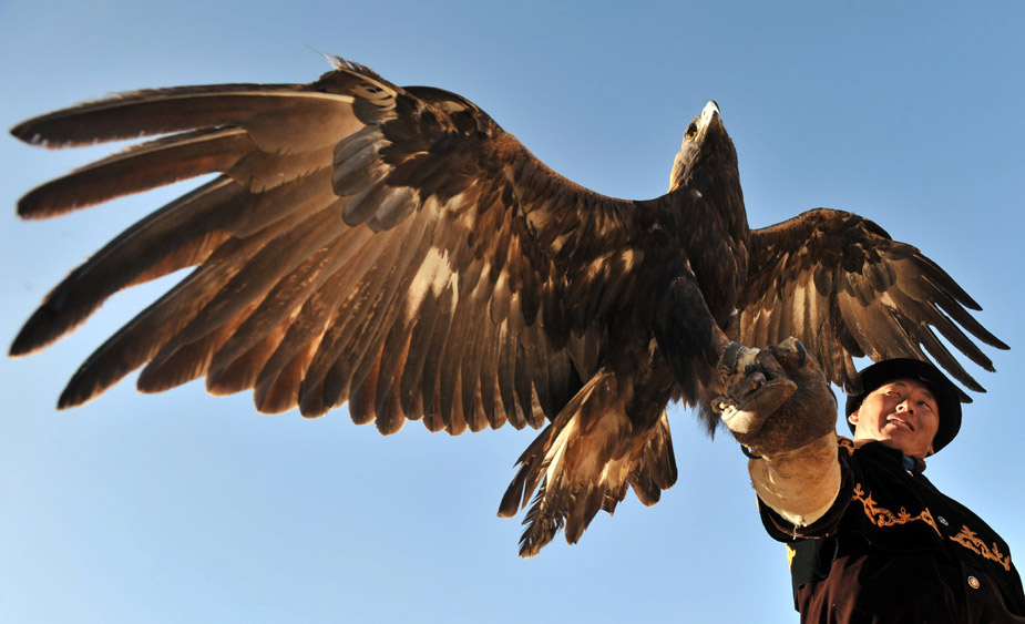 10月30日,在吉爾吉斯斯坦Bokonbayevo傳統的狩獵節上,一只捕獵鳥在追獵物。圖片來源:中國新聞網