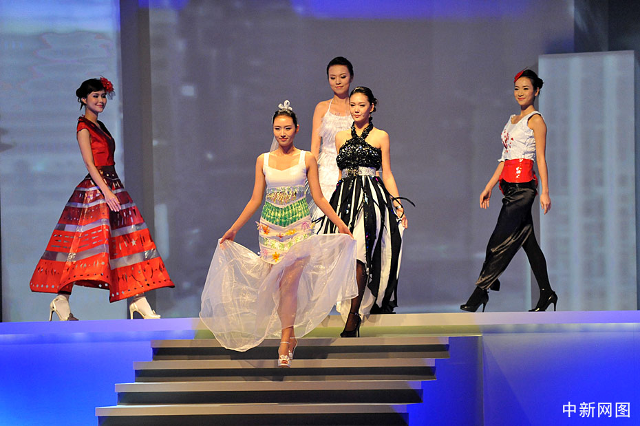 10月31日晚,“2009中華小姐環球大賽”總決賽上,12名入圍總決賽的佳麗身著各式服裝展現曼妙身姿,此外大賽還設計了一套“廢品服裝”呼吁環境保護。中新網記者 金碩 攝