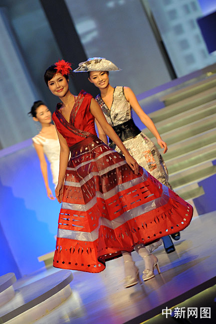 10月31日晚,“2009中華小姐環球大賽”總決賽上,12名入圍總決賽的佳麗身著各式服裝展現曼妙身姿,此外大賽還設計了一套“廢品服裝”呼吁環境保護。中新網記者 金碩 攝