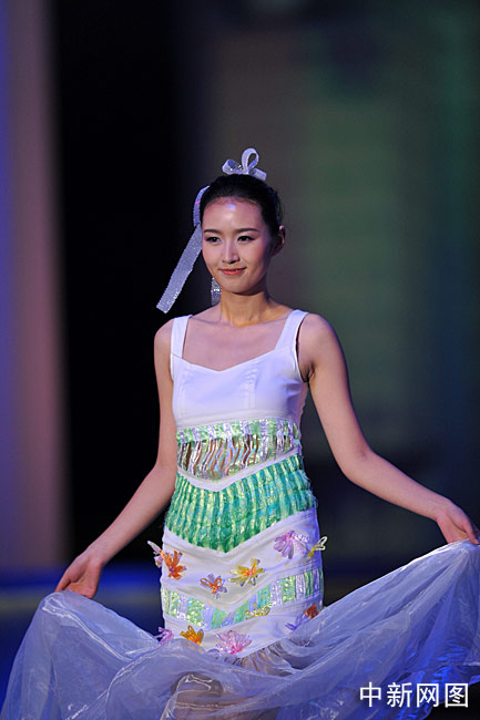 10月31日晚,“2009中華小姐環球大賽”總決賽上,12名入圍總決賽的佳麗身著各式服裝展現曼妙身姿,此外大賽還設計了一套“廢品服裝”呼吁環境保護。中新網記者 金碩 攝