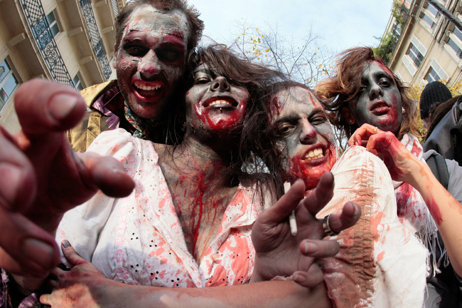10月31日是西方的“萬圣節”,世界各地的群眾穿著奇異的服飾、打扮鬼魅的造型迎接“鬼節”的到來。圖為在巴黎街頭,人們扮作“僵尸”迎接萬圣節。