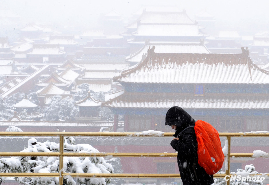 11月1日,深秋的北京大雪紛飛銀裝素裹,一名香港游客在北京景山上欣賞雪景。北京今年的初雪時間提前了整整一個月。中新社發 廖攀 攝