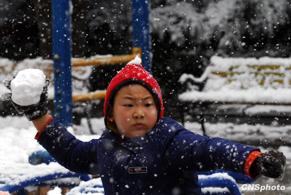 11月1日上午,北京下起一場大雪,為孩子們打雪仗提供了充分的“彈藥”。中新社發(fā) 侯宇 攝