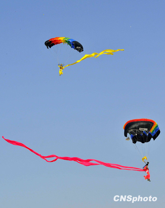 十一月三日,空軍八一飛行表演隊和空軍八一跳傘隊在北京沙河機場舉行預演,迎接中國人民解放軍空軍建軍六十周年。圖為空軍八一跳傘隊表演的仙女下凡。中新社發 潘旭臨 攝