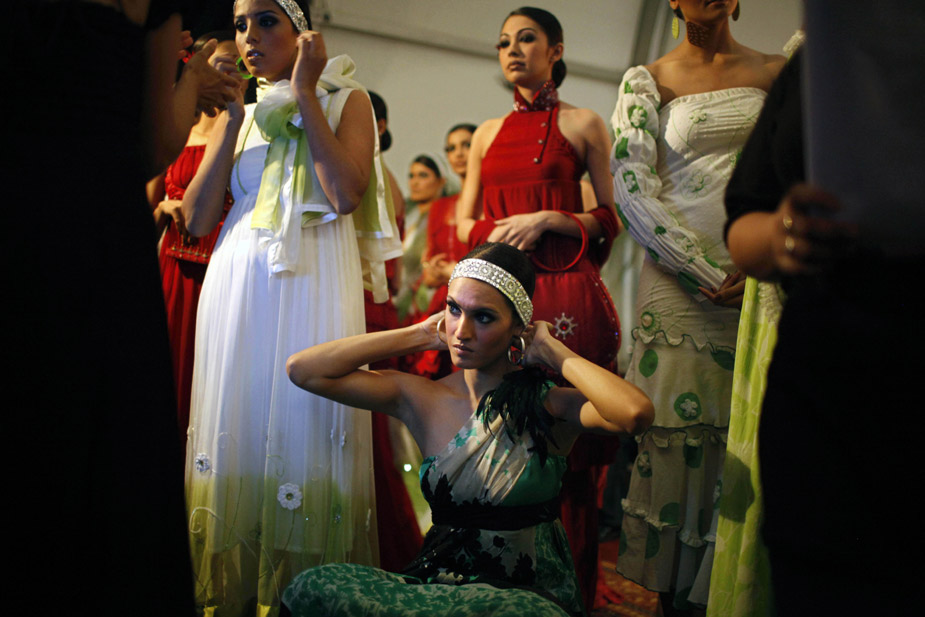 11月5日,巴基斯坦第一屆時(shí)裝周在卡拉奇拉開帷幕。美女模特們身著裸露雙肩和肚臍的非伊斯蘭傳統(tǒng)服裝在T臺上走秀。