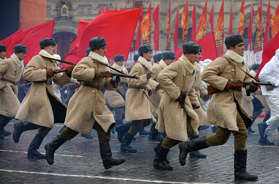 11月7日,俄羅斯士兵身穿二戰時期的軍服在莫斯科紅場舉行閱兵閱兵式紀念1941年紅場閱兵。圖片來源:中國新聞網