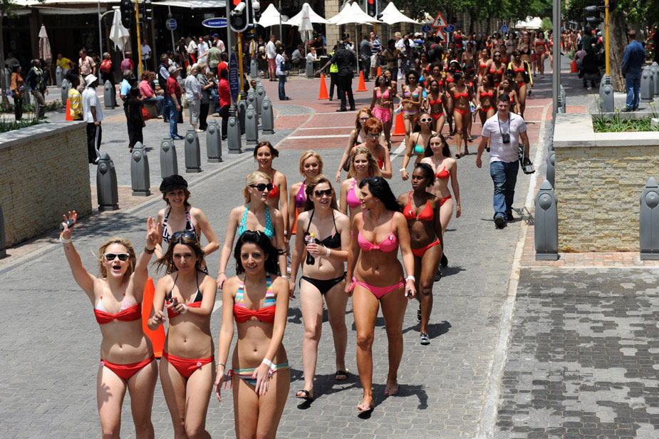11月7日,南非的約翰內(nèi)斯堡正值夏天,將近300位身穿比基尼泳裝的女郎齊聚游行。希望借此打破最大規(guī)模比基尼游行吉尼斯紀錄。