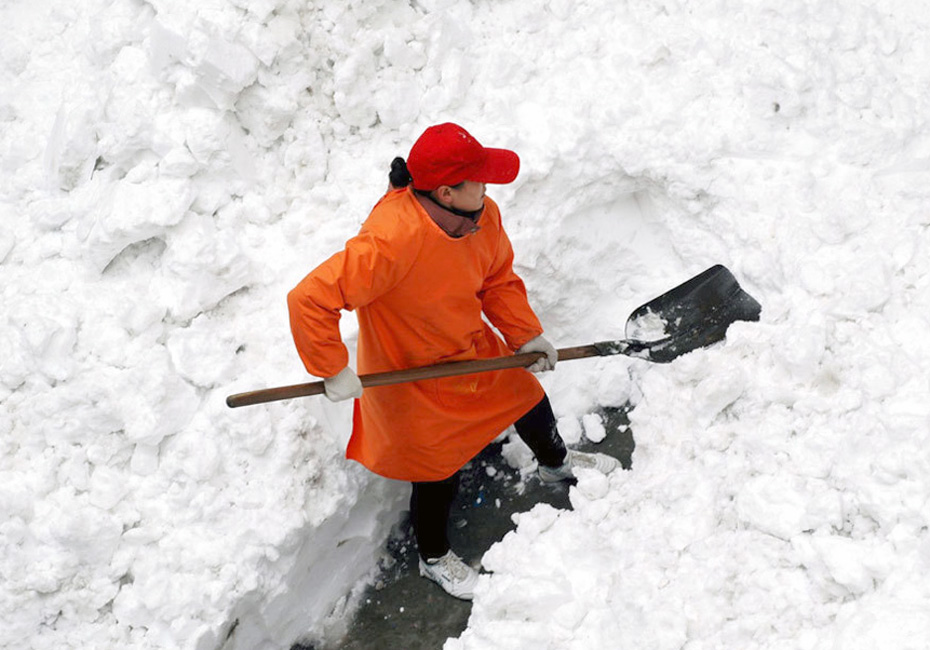 11月12日,河南省湯陰縣一居民正在清掃積雪。 中新社發 常中正 攝