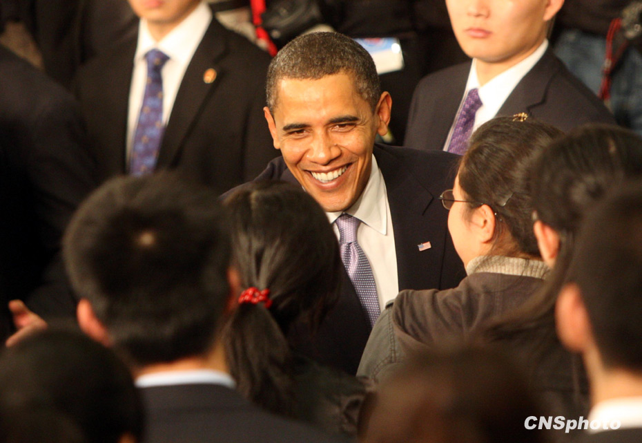 11月16日,正在中國進行國事訪問的美國總統奧巴馬,在上海就中美關系的未來向中國青年發表演講并回答提問。會后,奧巴馬走下講臺與中國青年握手致意。 中新社發 湯彥俊 攝